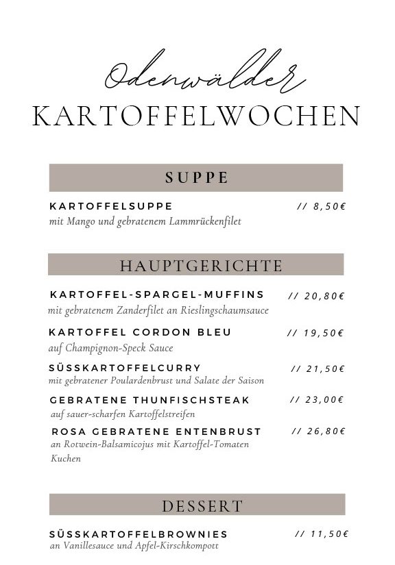 Erleben Sie die Faszination der Odenwälder Kartoffelwochen in unserem gemütlichen Restaurant. Lassen Sie sich von kreativen Kartoffelgerichten überraschen, die mit frischen, regionalen Zutaten zubereitet werden. Genießen Sie die herzliche Atmosphäre und tauchen Sie ein in die kulinarische Vielfalt, die die Kartoffel zu bieten hat!