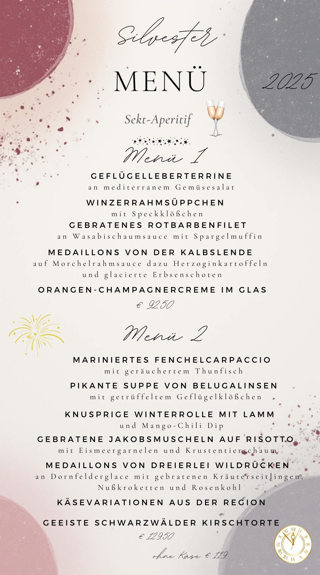 Erleben Sie einen unvergesslichen Abend mit kulinarischen Köstlichkeiten und in angenehmer Gesellschaft. Unser Silvestermenü ist ideal, um das alte Jahr stilvoll abzuschließen.Lassen Sie sich von unserem freundlichen Team verwöhnen und genießen Sie die festliche Stimmung.